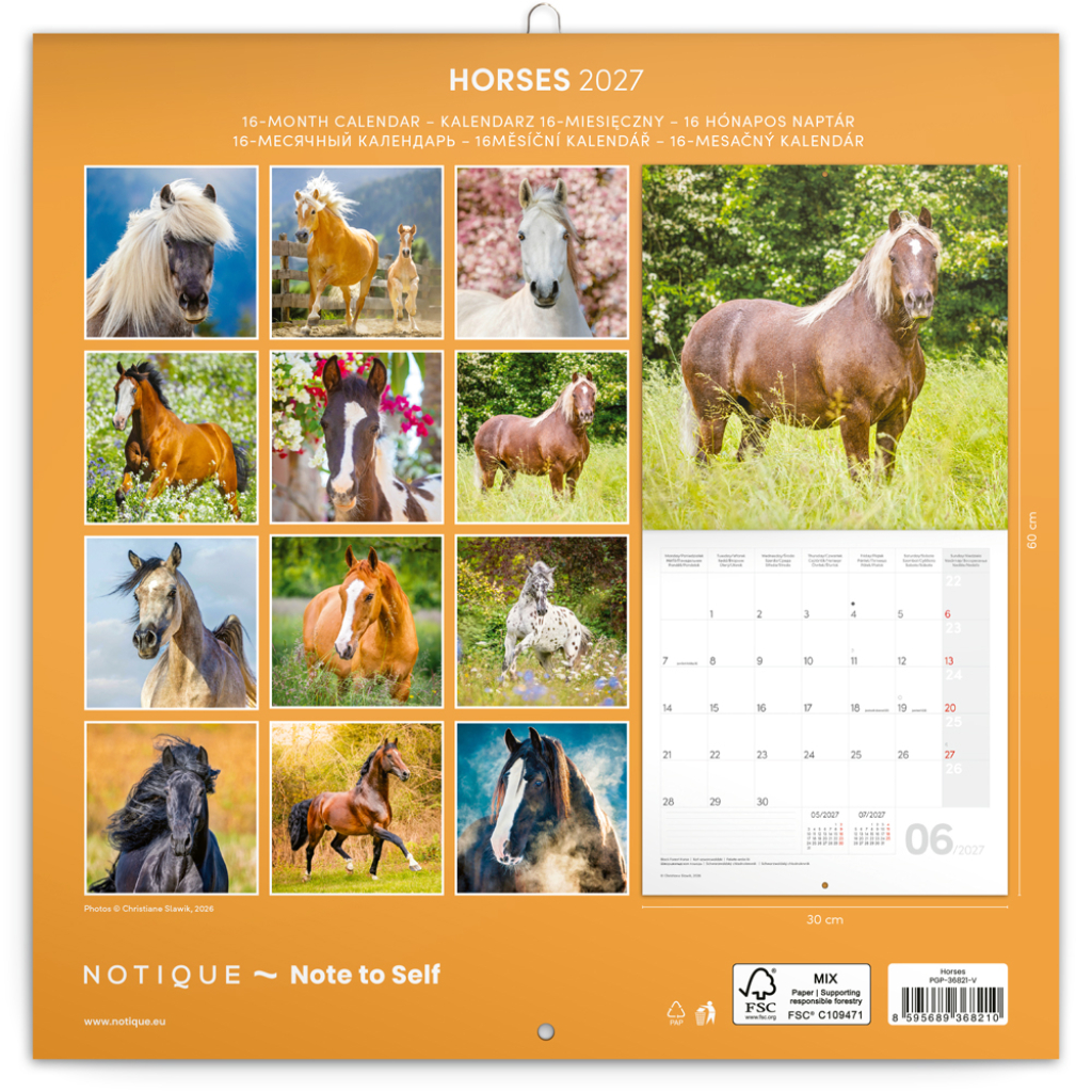 Majestátní krása koní na 12 snímcích známé německé fotografky Christiane Slawik. V kalendáři kromě fotek najdete přehledné kalendárium od září 2026 do prosince 2027 v šesti jazycích, měsíční fáze, důležité svátky a prostor pro poznámky na každý den.| EAN | 8595689368210 |