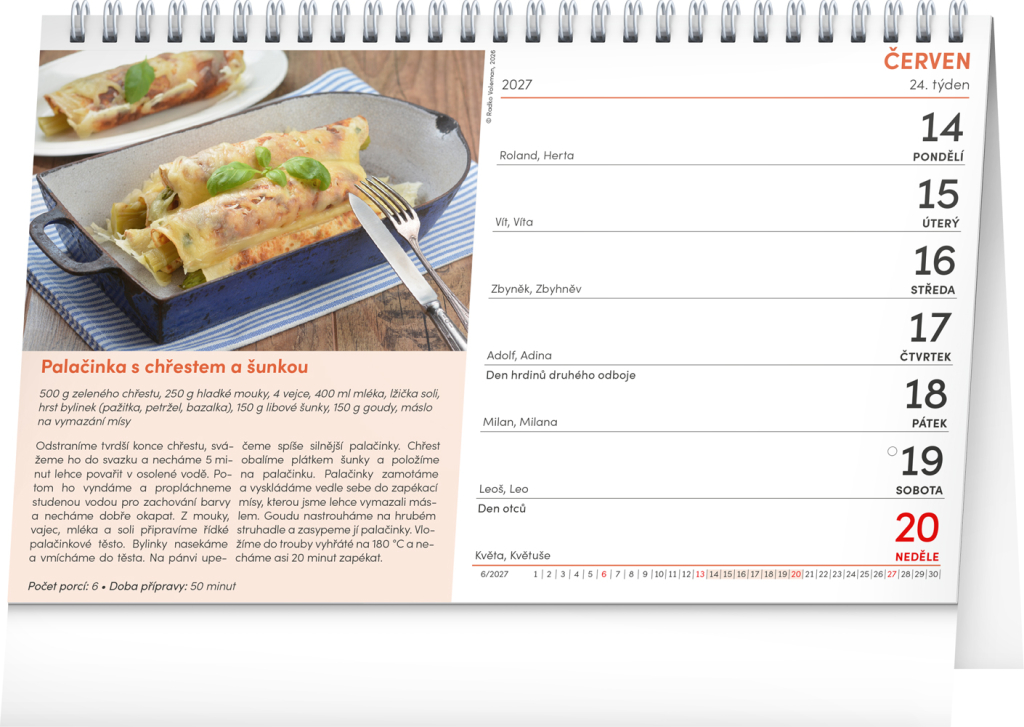 Pokud vás zajímají osvědčené recepty našich babiček, jejichž základem je poctivá domácí kuchyně, pak je tento kalendář je přesně pro vás. Přejeme vám dobrou chuť! Kalendář obsahuje týdenní české kalendárium se jmény, svátky a památnými dny.| EAN | 8595689369439 |