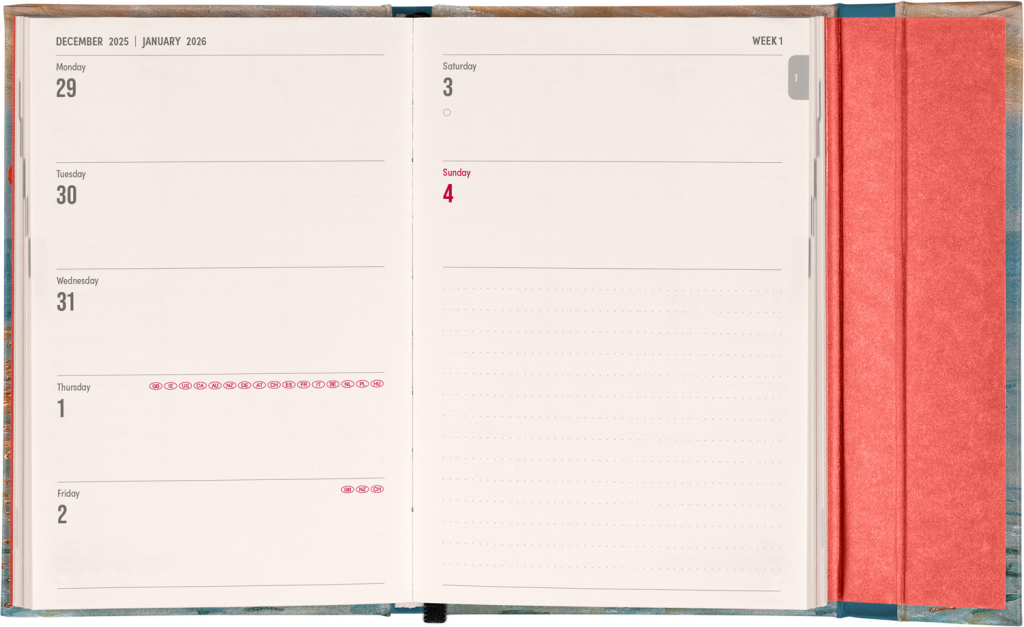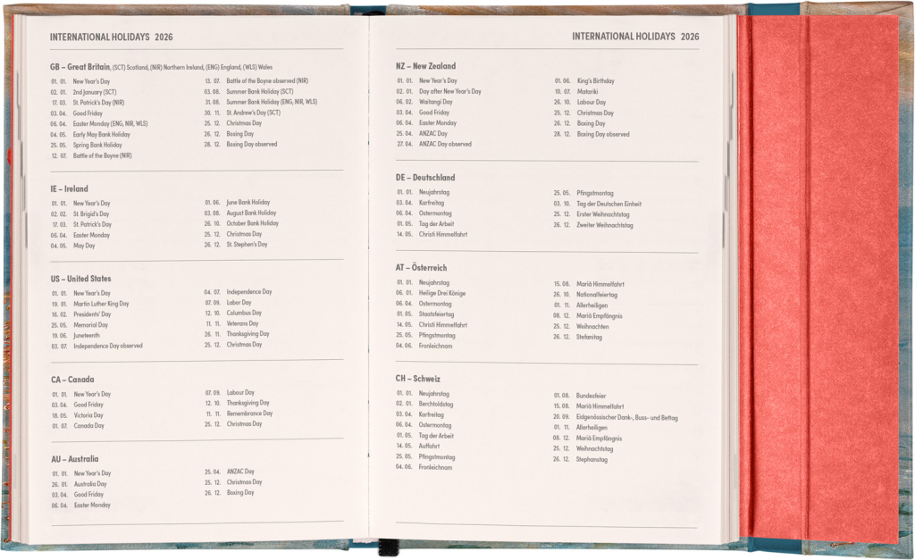 Týdenní diář v anglickém jazyce s mezinárodními svátky a praktickým magnetickým uzavíráním je ideální volbou pro ty, kteří chtějí mít své plány přehledně pod kontrolou. Nabízí horizontální rozložení ve verzi týden na dvou stranách s prostorem pro poznámky. Součástí jsou praktické měsíční přehledy, ideální pro plánování dovolených či prázdnin.| EAN | 8595689355685 |