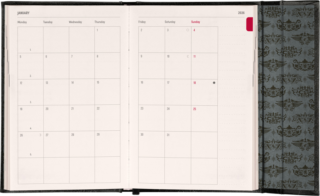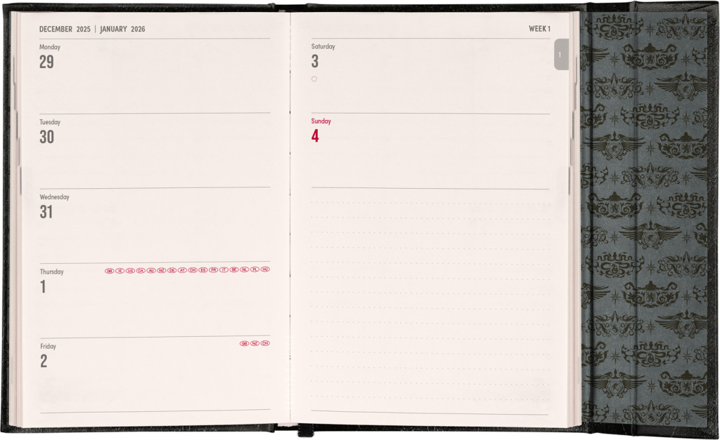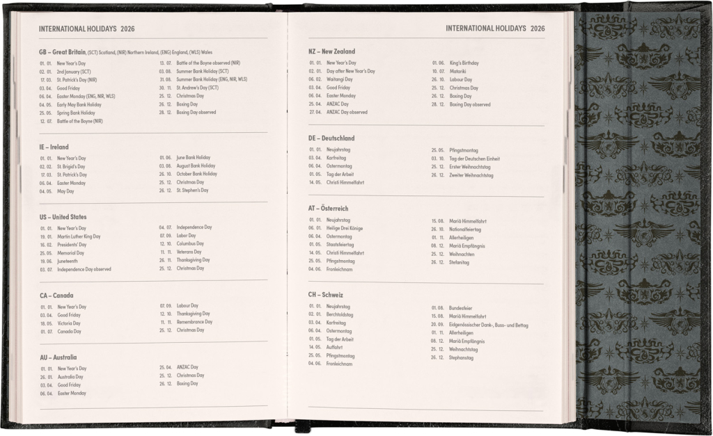 Týdenní diář v anglickém jazyce s mezinárodními svátky a praktickým magnetickým uzavíráním je ideální volbou pro ty, kteří chtějí mít své plány přehledně pod kontrolou. Nabízí horizontální rozložení ve verzi týden na dvou stranách s prostorem pro poznámky. Součástí jsou praktické měsíční přehledy, ideální pro plánování dovolených či prázdnin.| EAN | 8595689356859 |