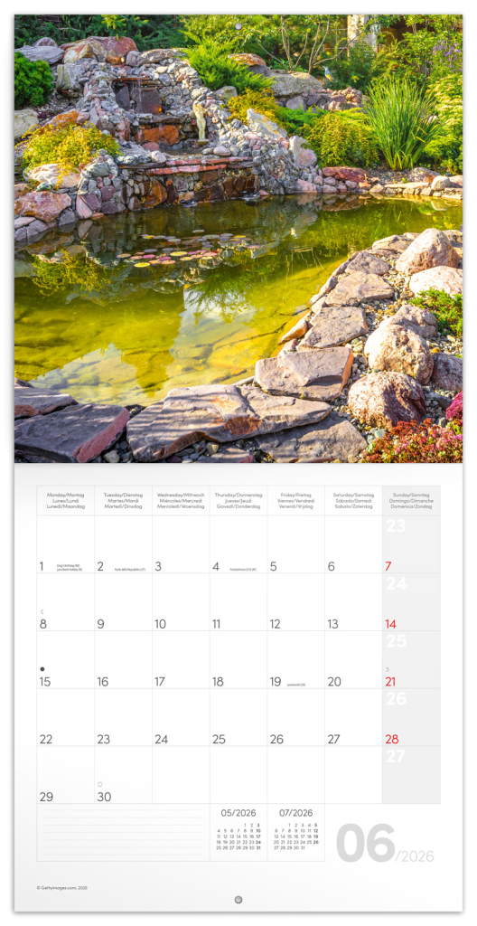 Rozjasněte svůj interiér barevnými fotografiemi šlechtěných zahrad. V kalendáři kromě fotek najdete přehledné kalendárium od září 2025 do prosince 2026 v šesti jazycích, měsíční fáze, důležité svátky a prostor pro poznámky na každý den.| EAN | 8595689351632 |