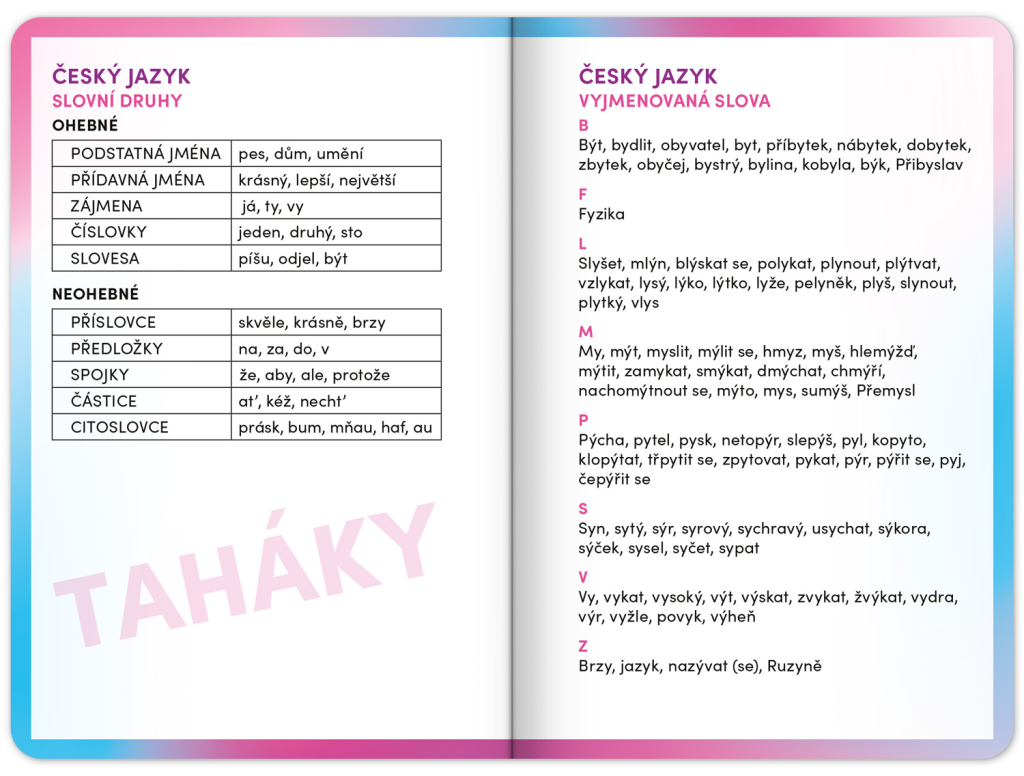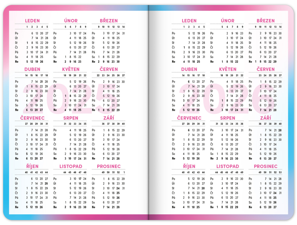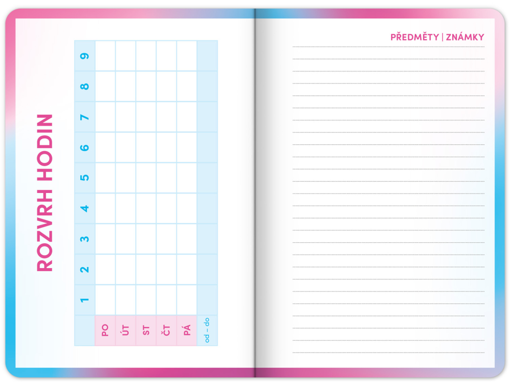 Školní diář obsahuje přehled na rok 2025 a 2026, české týdenní řádkové kalendárium se jmény a svátky, rozvrh hodin, prostor na poznámky a základní poznatky z češtiny, angličtiny, matematiky a fyziky pro školáky a školačky. Kalendárium začíná v září 2025 a končí v prosinci 2026.