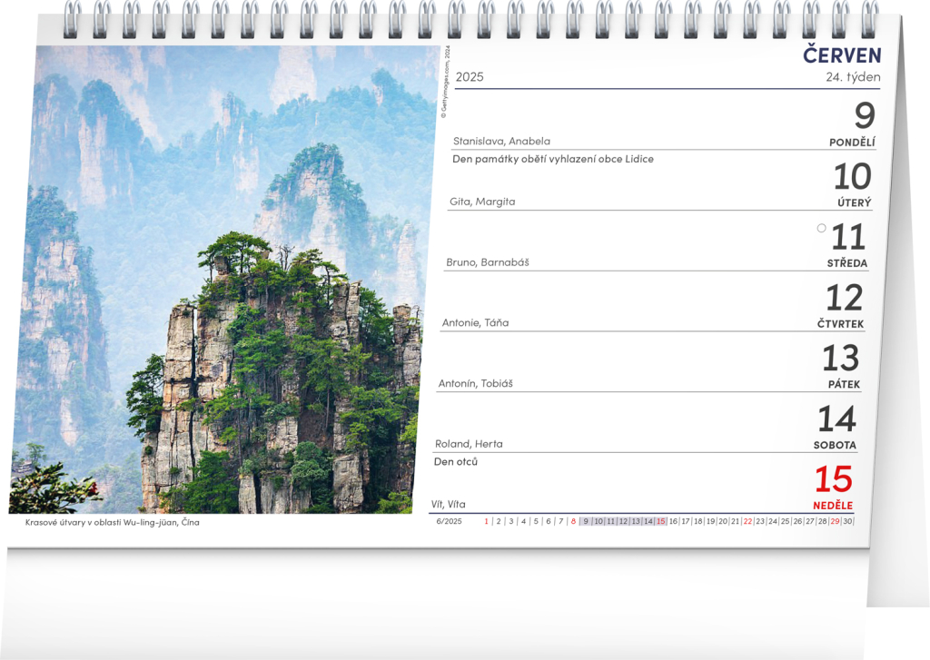 Stolní kalendář s fotografiemi hor a pohoří z celého světa. Prohlédněte si zblízka hory od Washingtonu v USA přes Evropu až po Čínu. Barevné fotografie doplňuje české týdenní kalendárium se jmény, svátky a památnými dny, fázemi měsíce, rozšířený seznam jmen a přehled na rok 2025 a 2026.