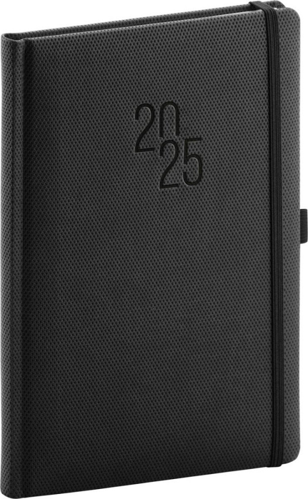 Týdenní diář Diamante 2025 v černé barvě. I zde je možnost ražby letopočtu a loga. Týdenní rozvrh s česko-slovenským kalendáriem a doplňkovou angličtinou, němčinou, maďarštinou a ruštinou.