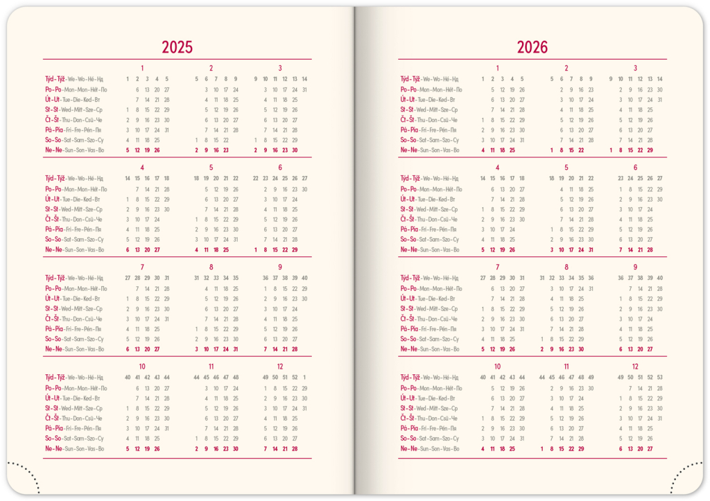 Týdenní diář Diamante 2025 v modré barvě. I zde je možnost ražby letopočtu a loga. Týdenní rozvrh s česko-slovenským kalendáriem a doplňkovou angličtinou, němčinou, maďarštinou a ruštinou.