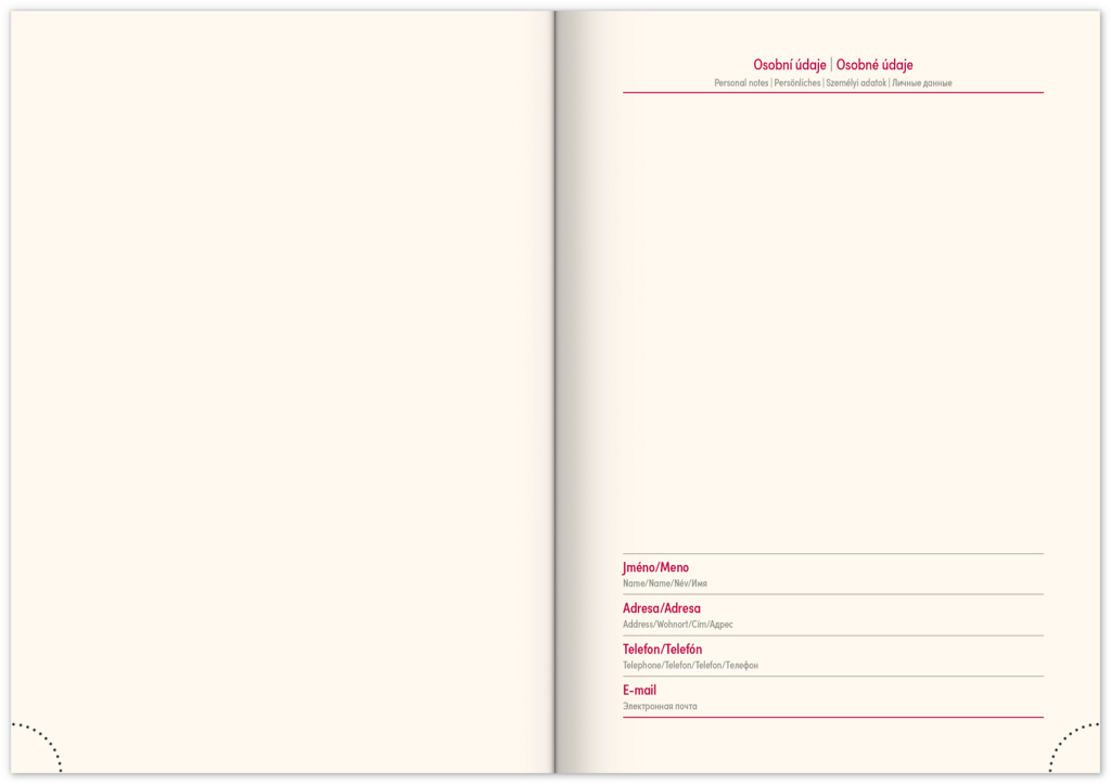 Týdenní diář Vellum 2025 v modré barvě. I zde je možnost ražby letopočtu a loga. Týdenní rozvrh s česko-slovenským kalendáriem a doplňkovou angličtinou, němčinou, maďarštinou a ruštinou.