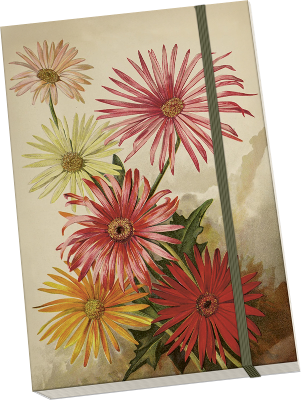 Notýsek Orange Autumn Plants Gerbera A5, 140 nelinkovaných stran, gumička, FSC® certifikace. Stylový, ekologický a ideální pro psaní i kreslení.