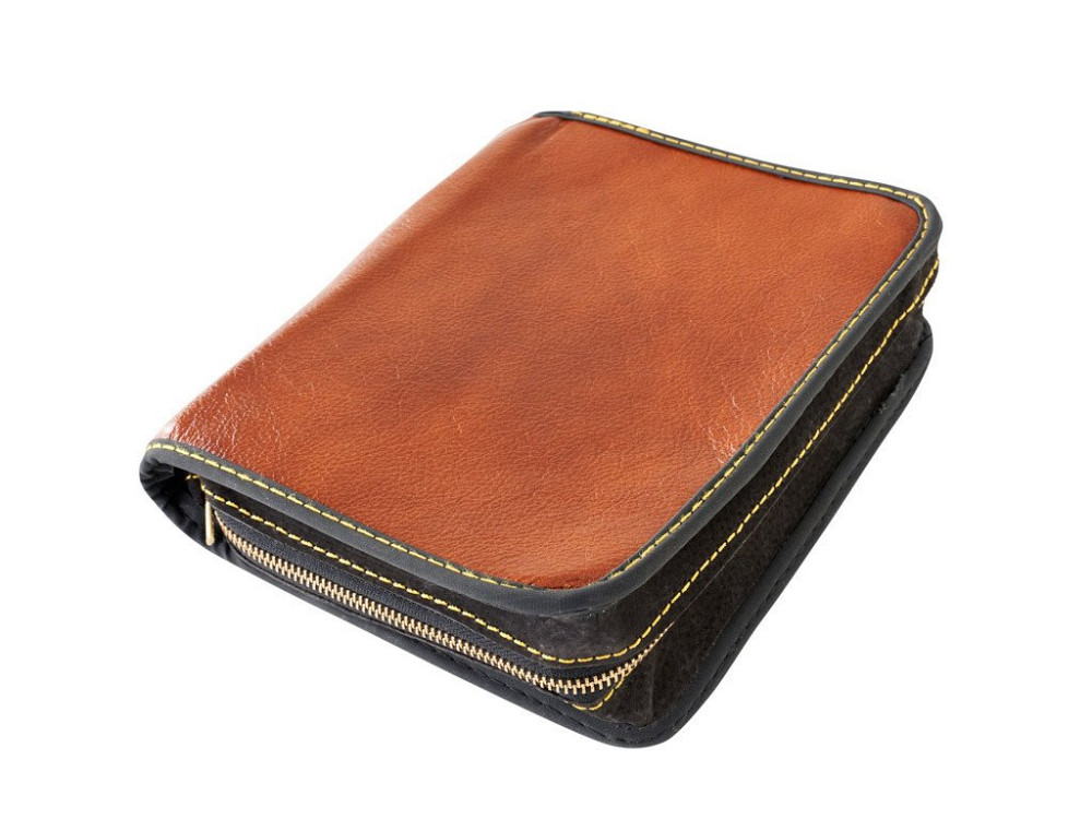 Přírodní kůže, kovový zip, ruční práce. Vhodné pro knihy o maximálních rozměrech: Výška: 22 cm, Šířka (součet 2x šířka + hřbet): 40 cm