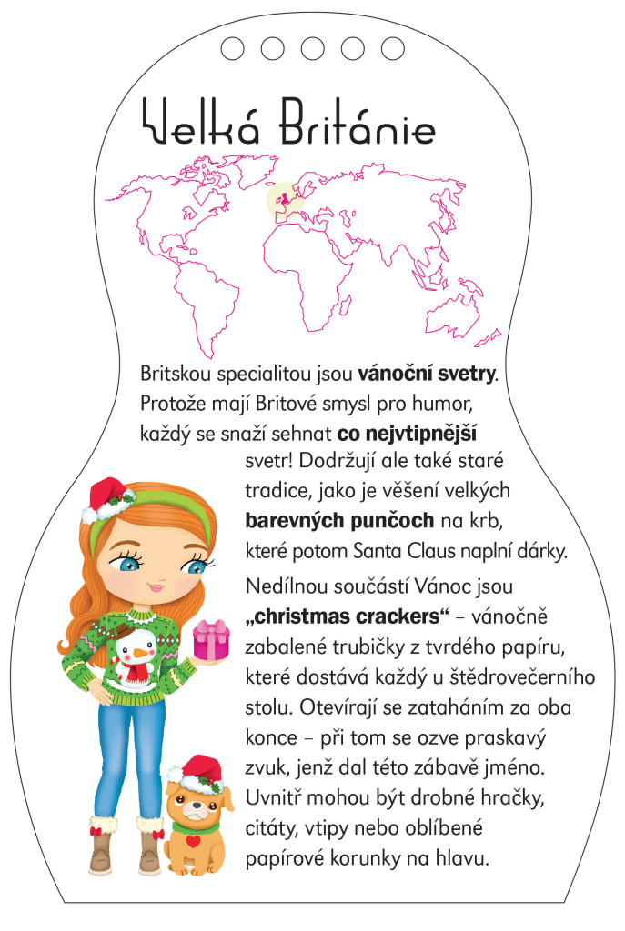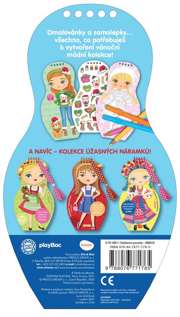 Další titul naší oblíbené série představuje malým čtenářům modely, které oblékají lidé z různých koutů světa u příležitosti Vánoc. Kreativní omalovánky, spousta samolepek… knížka obsahuje vše, co je třeba k vytvoření nesčetných vánočních modelů. A k tomu se děti dočtou i spoustu zajímavých informací navrch! Jak se slaví Vánoce ve Velké Británii, v Norsku, ve Francii, Rumunsku nebo třeba v Rusku? To a ještě mnohem víc se dozvíte, vydáte-li se za poznáním s našimi panenkami. A ke každé knížce dostanete krásný náramek pro štěstí!