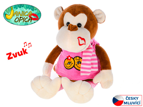 Opica Janica je plyšová opička, která umí česky mluvit. Janica měří 40 cm, má krásný růžový obleček, kolem krku omotanou šálu a na tváři červený polibek. Skvělá česky mluvící hračka pro všechny děti. S Opicou Janicou se nikdo nikdy nudit nebude!