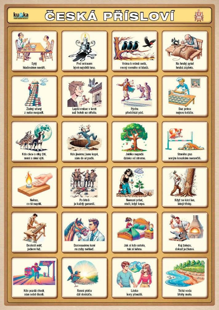 Sbírka 48 nejznámějších českých přísloví s originálními ilustracemi nabízí poutavý vhled do lidové moudrosti a pomáhá porozumět jejich významu i snadněji si je zapamatovat.