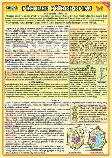 - kapitoly: Přírodopis jako věda, Organismy a jejich členění, Viry, Buňka, Jednobuněčné organismy (Bakterie a sinice, Řasy, Prvoci, Kvasinky), Houby (Nižší houby, Vyšší houby, Lišejníky), Mnohobuněční živočichové (Žahavci, Ploštěnci, Hlísti, Měkkýši, Kroužkovci, Ostnokožci, Členovci, Strunatci), Vyšší rostliny, Kořen, Stonek, List, Květ, Plod, Pletiva, Výtrusné rostliny (Mechorosty, Kapraďorosty), Semenné rostliny (Nahosemenné, Krytosemenné)
