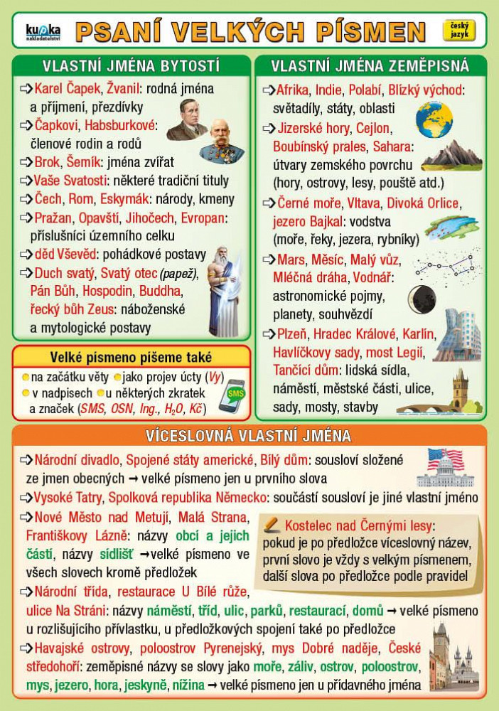 Přehledně zpracovaná a bohatě ilustrovaná pomůcka pro hravé zvládnutí psaní velkých písmen v češtině (včetně tabulky pozor na rozdíly).