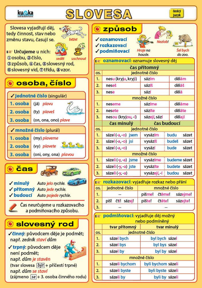 Titul přehledně zpracovává téma slovesa v češtině a vysvětluje gramatické kategorie sloves, druhy sloves a slovesné tvary.