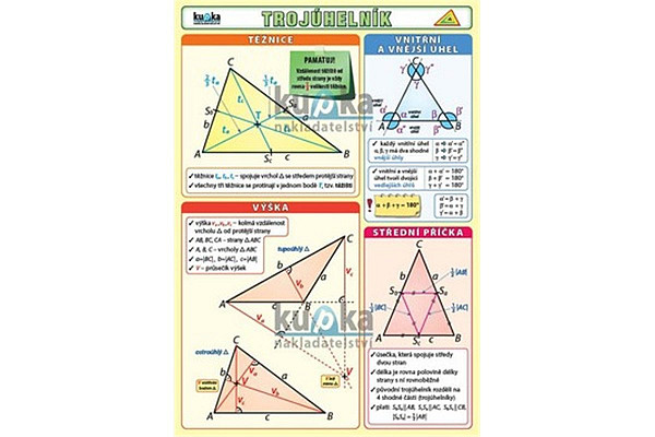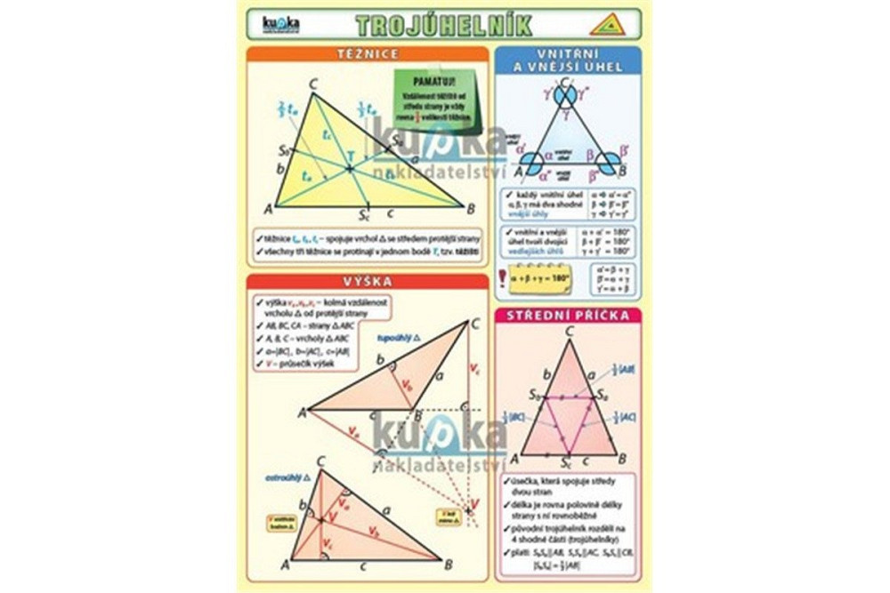 Přehledně zpracované téma trojúhelník s názornými nákresy (vhodné pro 2. stupeň ZŠ a SŠ). Titul obsahuje základní pojmy jako je těžnice, vnitřní a vnější úhel, výška, střední příčka. Na zadní straně najdete rozdělení trojúhelníku podle velikosti úhlů a velikosti stran.