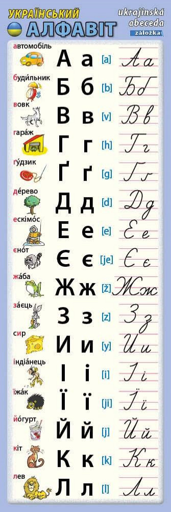 Záložka obsahuje přehledně zpracovanou ukrajinskou abecedu včetně výslovnosti a názorného obrázku.