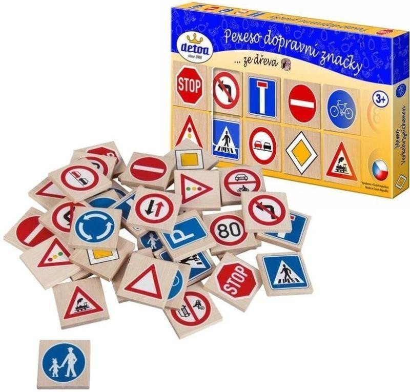 Pexeso, populární dětská stolní hra. Dopravní značky, jeden z předpokladů bezpečné orientace v dopravě. Děti se hravou formou naučí základní dopravní značky.