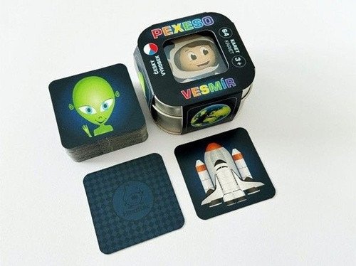 Originální pexeso v malé plechové krabičce s krásně ilustrovanými obrázky z vesmíru. Kartičky jsou vyrobeny z kvalitního karetního kartonu se speciálním karetním lakem, který zaručí opravdu dlouhou životnost kartiček. Plechová krabička obsahuje 64 karet.
