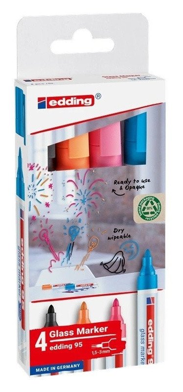 Popisovač edding 95 na všechny skleněné povrchy. Inovativní inkoust nabízí vynikající krycí schopnost - zářivé barvy zajistí, že je stopa i na barevném skle dobře viditelná. Popisovač využijete na sklo, skleněné tabule, zrcadla i na bílé tabule. Praktickou vlastností je smazatelnost stopy zasucha - není nutné používat vlhký hadr. Inkoust je rychleschnoucí a nezanechává žádný mastný film. Popisovač je ihned použitelný - stačí sejmout víčko a psát. Užitečný je především při prezentacích, schůzkách i při běžném zapisování poznámek a myšlenek. Ideální je také pro dočasné vzkazy na zrcadlech nebo pro vyzdobení oken. Sada 4 barev: černá, oranžová, růžová a světle modrá. Barvy oranžová a růžová jsou fluorescentní pod UV lampou. Kulatý hrot. Šíře stopy: 1,5-3 mm. Kartonový obal (z 90 % karton certifikovaný FSC). Vyrobeno v Německu.