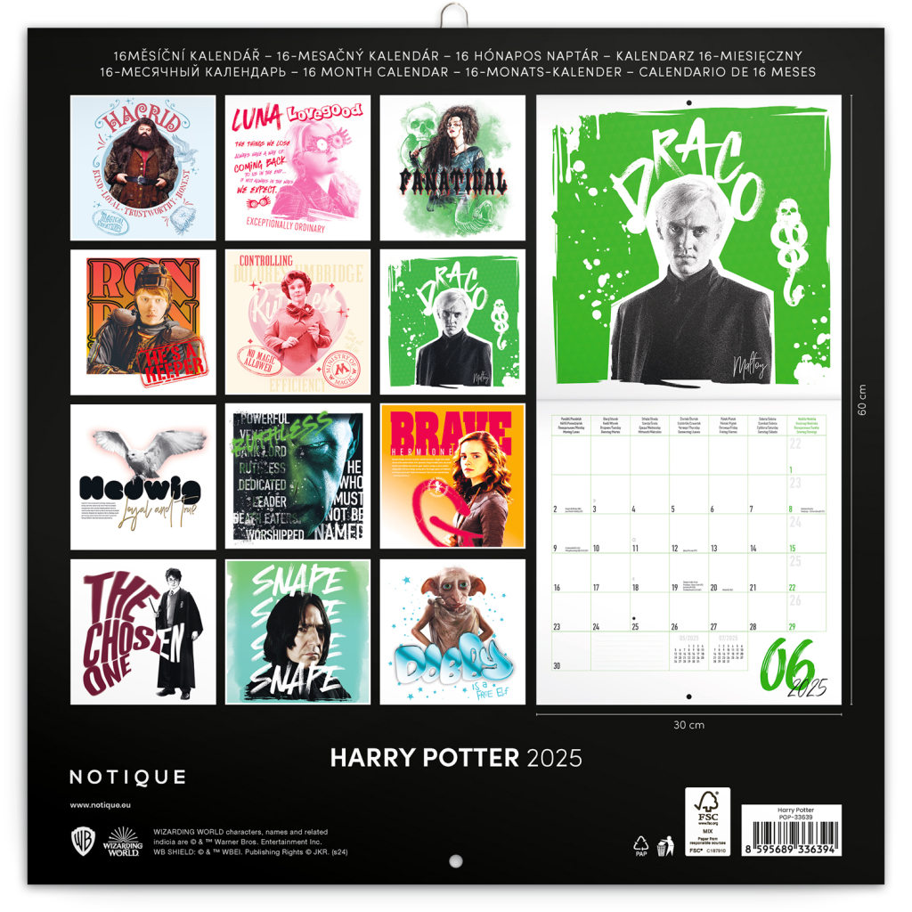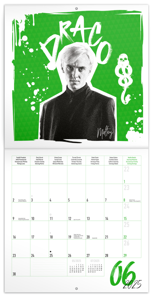 Poznámkový kalendář s dvanácti fotografiemi oblíbených hrdinů z kouzelnického světa obsahuje také přehled čtyř posledních měsíců roku 2024 a osmijazyčné kalendárium na rok 2025 s mezinárodními svátky.