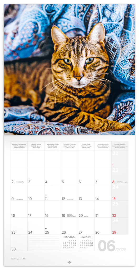 Poznámkový kalendář pro milovníky chlupatých kočičích přátel a jejich komplikovaných osobností. Šestijazyčné kalendárium nabízí dost prostoru pro vaše poznámky a plány, dále obsahuje fáze měsíce a důležité svátky.