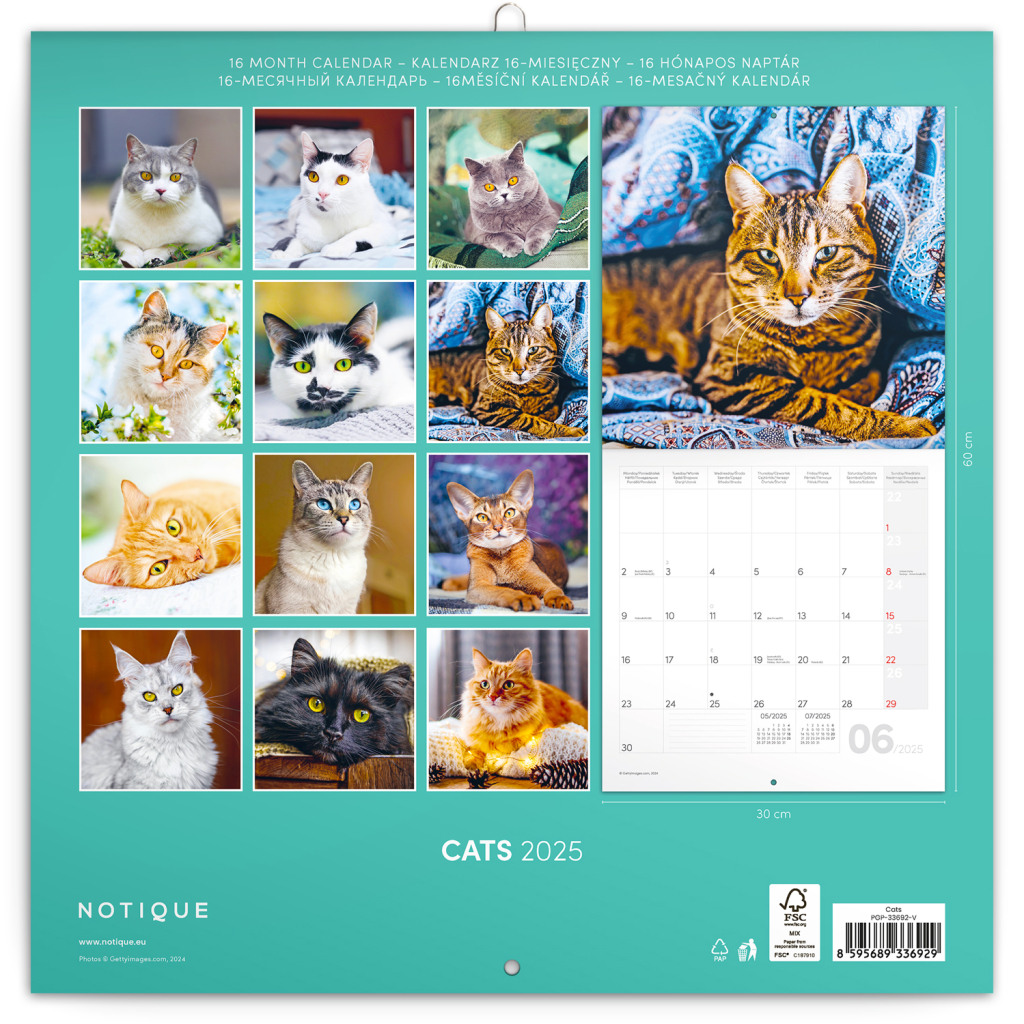 NOTIQUE Poznámkový kalendář Kočky 2025, 30 x 30 cm