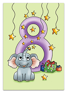 Blahopřání k 8.narozeninám se sloníkem. Přání je vevnitř zdobeno motivy z titulní strany s textem Všechno nejlepší k narozeninám!. Baleno v bílé obálce. Rozměr 19,5x13,5cm.
