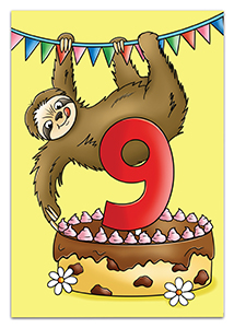 Blahopřání k 9.narozeninám s lenochodem. Přání je vevnitř zdobeno dětskými ornamenty s textem Všechno nejlepší k narozeninám!. Baleno v bílé obálce. Rozměr 19,5x13,5cm.