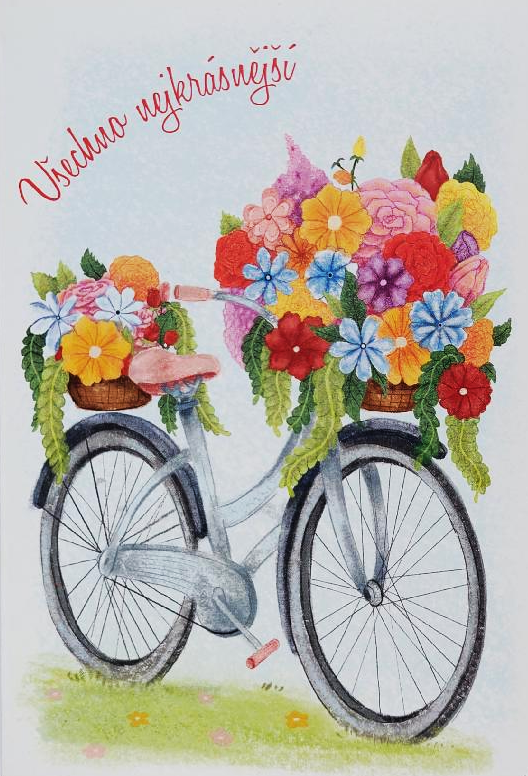 Detailně kreslené blahopřání s textem na titulce Všechno nejkrásnější s obrázkem kola s květinami, určitě udělá mnouhem větší radost nez zaslaná sms. Přání je vevnitř zdobeno motivem z titulní strany s textem: Plný košík něžných květů, z nich ti přání dneska spletu. Krásné narozeniny! Baleno v bílé obálce. Rozměr 17x11,5 cm.