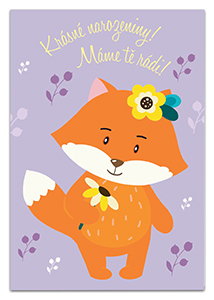 Blahopřání dětské k narozeninám s lištičkou. Přání je vevnitř zdobeno motivy z titulní strany. Nemá předepsaný text. Baleno v bílé obálce. Rozměr 19,5x13,5cm.