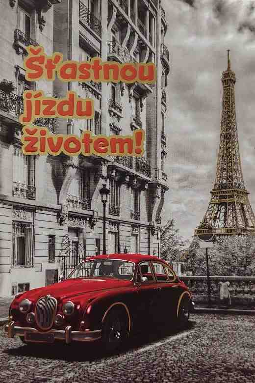 Blahopřání k narozeninám s textem na titulce Šťastnou cestu životem! Titulní strany zdobena zlatým potiskem. Přání je vevnitř zdobeno motivem z titulní strany a textem: Ať máš tolik důvodů k úsměvu, kolik má tvoje auto koní pod kapotou. Krásné narozeniny! Baleno v sáčku, součástí je bílá obálka. Rozměr 17x11,5cm.