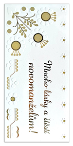 Blahopřání novomanželům ve zlatobílé barvě s bílou obálkou. Uvnitř nemá předepsaný text. Rozměr 21x10cm.