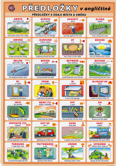 Anglické předložky s českým překladem a ilustrovaným příkladem. Obsahuje předložky s údaji místa a směru, předložky s údaji času a předložkové vazby; ilustrace Adolf Dudek.
