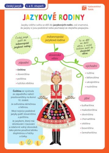 Přehledová tabulka: Jazykové rodiny, národní jazyk pro 1. stupeň základní školy, v jedné tabulce, která se vejde do každého sešitu či notýsku. Tento bohatě ilustrovaný a přehledný malý pomocník se hodí všem, bez ohledu na to, jestli je to školák, nebo ne.