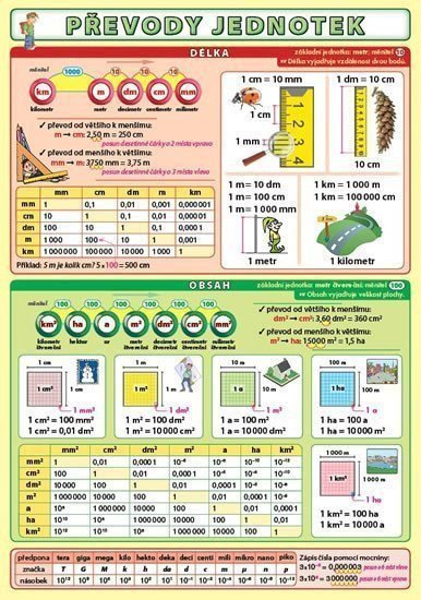 Přehledně zpracované převody jednotek délky, obsahu, objemu, hmotnosti a času.