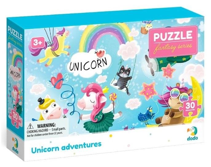Puzzle - Dobrodružství jednorožců. Počet dílků: 30 Věk: 3+ Rozměr složeného puzzle: cca 27 x 20 cm Rozměr balení: 14 x 21 x 4 cm