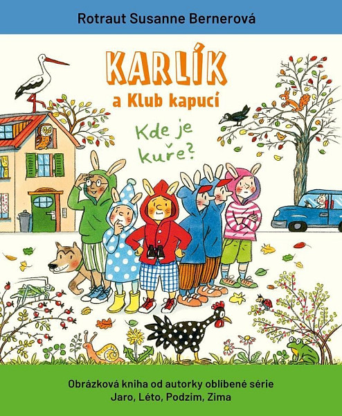 Karlíkovi se ztratilo kuře. Pojďte ho spolu s ním a jeho kamarády v kapucích hledat. Potkáte při tom veverku, čápa, sovu a spoustu dalších zvířat. Půjde s vámi i pes Baryk. Kde jenom to kuře může být? Na louce? Ve městě? V parku? Nebo v lese? Vyprávěcí obrázky R. S. Bernerové okamžitě připomenou známé Jaro, Léto, Podzim a Zima. Jen v Karlíkově světě žijí místo lidí králíci a jeho kreslená dobrodružství doprovázejí krátké texty. Děti si budou knížku rády prohlížet s dospělými, ale určitě to zvládnou i samy.