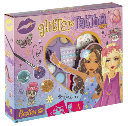 Sada Třpytivého tetování Besties obsahuje aršíky s tetováním, nalepovací trpytivé kamínky, 5 barev třpytek, dva štětce, šablony a lepidlo.