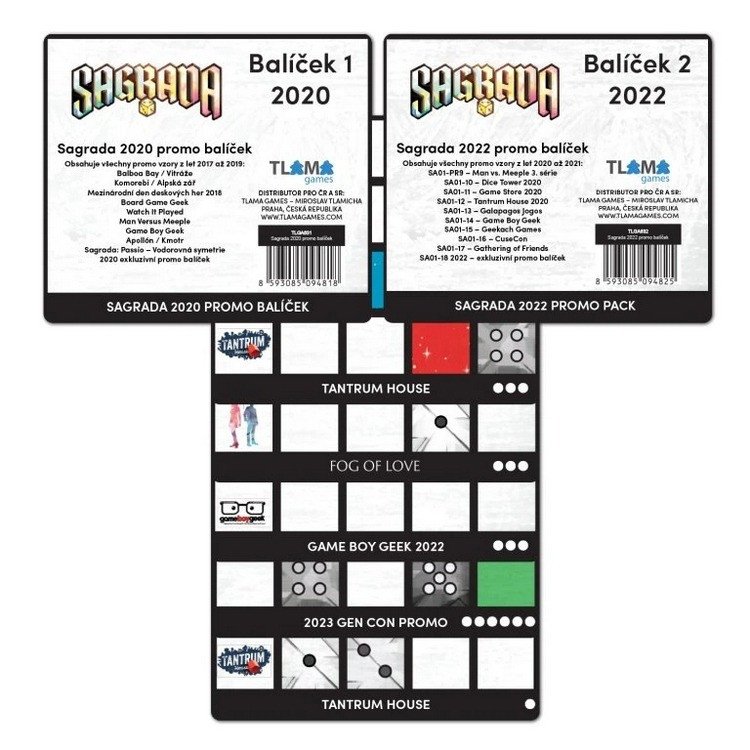 Doplňte svou sbírku o všechny Sagrada promo karty vydané až do vydání remasterované edice v roce 2026! Tento balíček obsahuje 29 promo karet vitráží, které byly k dispozici pouze na festivalech, na kanálech některých recenzentů nebo byly součástí balení jiné hry. Dále je tu jedna karta vydaná výhradně v Polsku a dvě, které najdete jen v tomto balíčku!