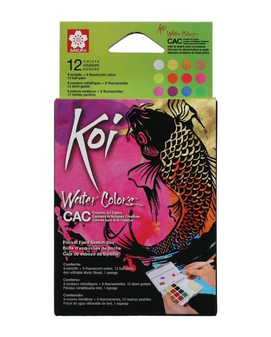 Koi Water Colors 12 Creative Art Colors (CAC) je sada akvarelových barev plná jedinečných barev a povrchových úprav pro jedinečné projekty. Tato kompaktní sada obsahuje 4 metalické a 8 fluorescenčních barev a obsahuje míchací paletu ve víčku krabičky, houbičku a Koi Water Brush (štětec s nádržkou na vodu). Vytvořte si vlastní jedinečné barvy smícháním metalických a fluorescenčních barev nebo prozkoumejte zcela nové spektrum úžasných efektů smícháním těchto kreativních uměleckých barev s tradičními akvarelovými barvami. Bohatý barevný sortiment Koi nabízí možnost volby při vytváření odvážných odstínů nebo jemných a decentních odstínů s přidáním metalických a fluorescenčních akvarelových barev. Mějte tuto malou sadu po ruce ve svém ateliéru pro rychlé stříkání barev a vytváření hlubokých stínů pro pozadí. Nebo si ji vezměte s sebou na tvorbu portrétů a plenérových krajin v přírodě. Tato krabička kapesní velikosti se také skvěle hodí k přidávání barev do komiksů, ilustrací a projektů s písmem.
