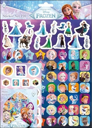 Set obsahuje velký list samolepek s blyštivým efektem, list papírových samolepek a sáček s malými samolepkami s blyštivým efektem.