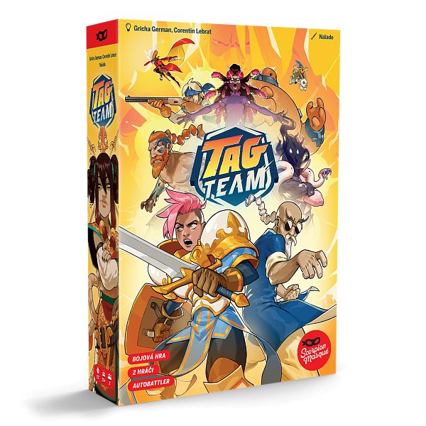 CO JE TOHLE ZA HRU? Tag Team je autobattler a deckbuilding hra… s jedním rozdílem! Co je autobattler? Začíná se přípravnou fází plnou rozhodování, po níž následuje fáze boje, kdy už hráči nemohou nic změnit. Prostě musí počkat, jak to dopadne! Co je deckbuilding? Deckbuilding vám umožní v průběhu hry přidávat karty do svého balíčku, čímž se balíček stane silnějším a účinnějším proti vašemu protivníkovi. V čem je háček? Ve hře Tag Team nikdy nemícháte svůj balíček. Budete strategicky přidávat karty, aniž změníte stávající pořadí karet v balíčku. Ve hře Tag Team hráči kombinují jedinečné balíčky 2 bojovníků, aby v průběhu několika kol bojovali proti svému soupeři. Začnete s bojovým balíčkem složeným pouze ze 2 karet (jedna pro každého z vašich bojovníků). - Bojujte! Současně odhalte jednu kartu a postupujte podle pokynů na kartách. Když zahrajete obě vaše karty, kolo končí. - Teď stavějte! Doberte 3 karty ze svého “build” balíčku (složeného z balíčků vašich 2 bojovníků) a přidejte jednu z těchto karet do svého bojového balíčku, aniž byste měnili pořadí karet, které tam již jsou. Bude vaše útočná karta zablokována vaším protivníkem, nebo se mu vyhnete? - Začíná nové kolo, znovu bojujte, ale tentokrát budete hrát 3 karty. Bojujte a stavějte, dokud jeden z vás nebude K.O.! Obsah balení: 12 desek bojovníků 120 karet boje 12 karet draftu 21 žetonů 40 kostiček síly (fialových) 6 ukazatelů zdraví (zelené) 4 speciální ukazatele (žluté) 1 česká pravidla boje 1 česká příručka bojovníka