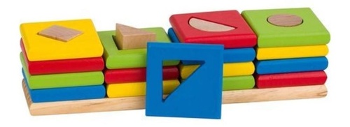Třídění barevných čtverců kombinované s různým tvarem otvorů pro nasouvání na stejně vysoké kolíky.