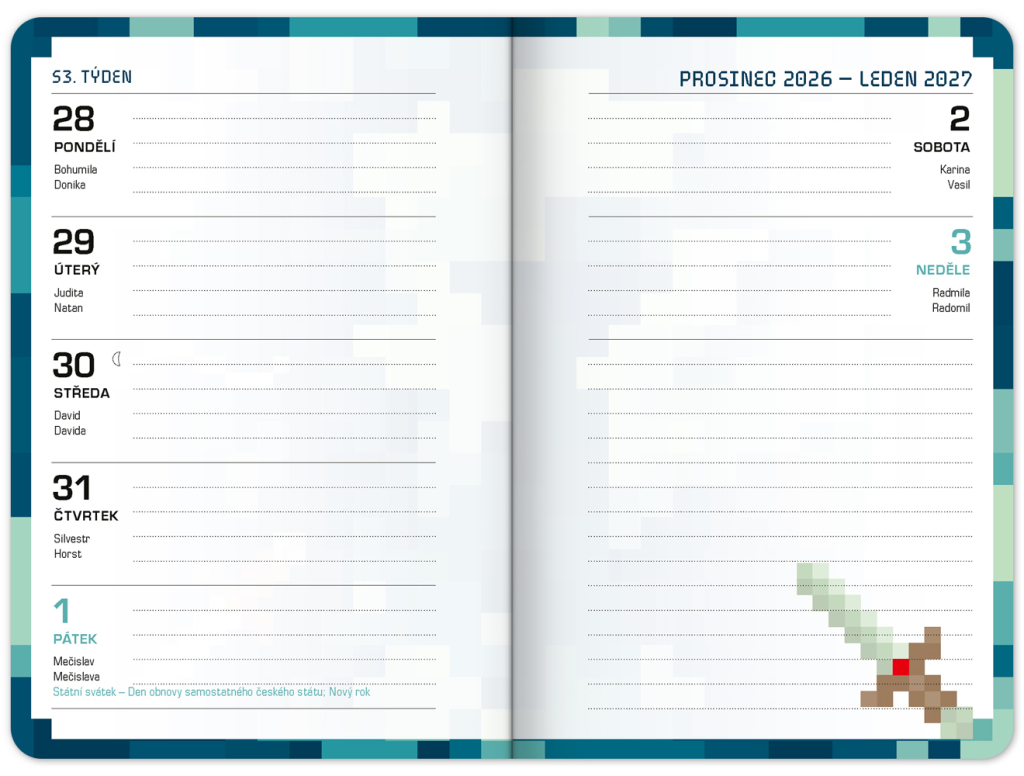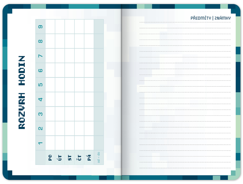 Praktický školní diář pro všechny školáky s motivem stavební videohry. Obsahuje taháky z češtiny, matematiky a angličtiny. Hodit se budou také rozvrhy hodin a přehled termínů prázdnin.