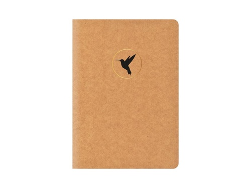 Školní linkovaný sešit ve formátu A4, v hnědé barvě, s motivem kolibříka, v originálních deskách z kraftového papíru. Stránky jsou opatřeny okraji o šířce 1,5 cm.