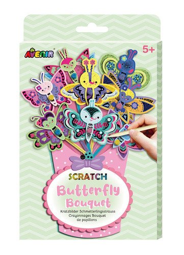 Zábavná sada škrábacích aktivit pro děti, aby vytvořily krásné kytice s motivem motýlů. S škrabacími listy, čističi (fuzzy tyčinky), balicím papírem a stuhou, které jsou součástí balení, mohou děti podle pokynů krok za krokem snadno vytvořit zcela personalizovanou hezkou kytici.