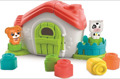 Veselý domeček se zvířátky a skládačkami uvnitř. Dopřej svému dítěti hru s 8 barevnými dílky a zvířátky.