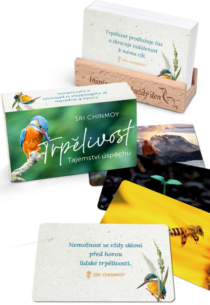 „Trpělivost prodlužuje čas,“ říká Sri Chinmoy, autor této sady 55 aforismů. Obzvlášť na dnešní uspěchanou dobu může být trpělivost výborným lékem, který nám vydláždí cestu k úspěchu – a zároveň vnese do našeho života více klidu a radosti. S dřevěným gravírovaným stojánkem na vystavení kartiček.