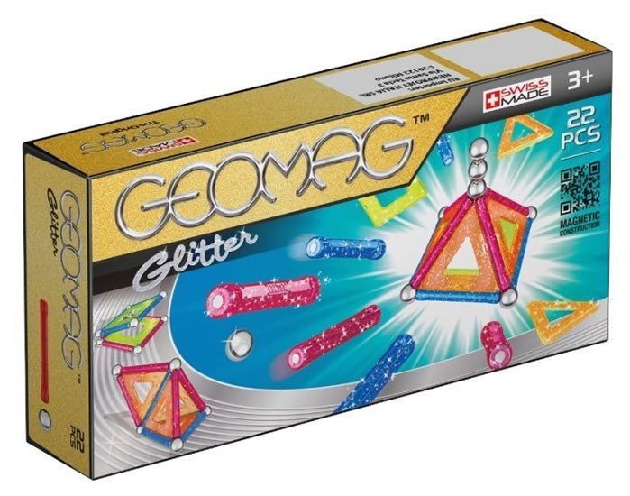 Magnetická stavebnice Geomag obsahující v dlouhých tyčkách i výplních unikátní třpytky. Stavebnice je určena pro děti od 3 let.