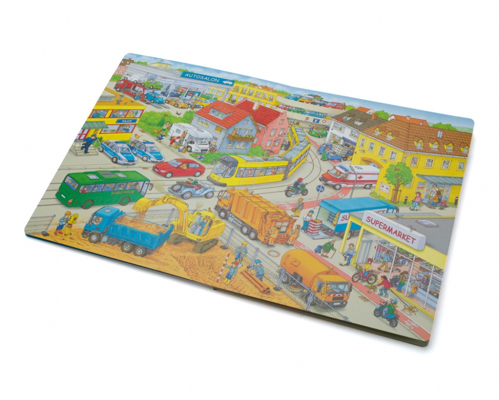 Tato velkoformátová kniha přináší panoramatické obrazové vhledy do prostředí silnic, staveb, ale i jiných. Bohatě propracované názorné ilustrace jsou pro děti velkým lákadlem, bezednou studnicí inspirace a zároveň obrovskou výzvou – množství detailů je přitahuje, podněcuje jejich představivost a fantazii. Malý vypravěč v interakci s dospělým nejen popisuje, co vidí na obrázcích, ale také v nich hledá, a hlavně kreativně a hravě rozplétá a opět spojuje nekonečné nitky možných příběhů. Knihy tak velmi účinně napomáhají budování slovní zásoby, komunikačních schopností i logického myšlení. Dítě tříbí svůj postřeh, zrakovou a sluchovou paměť, a činí tak první krůčky na své cestě k rozvoji aktivního čtenářství.